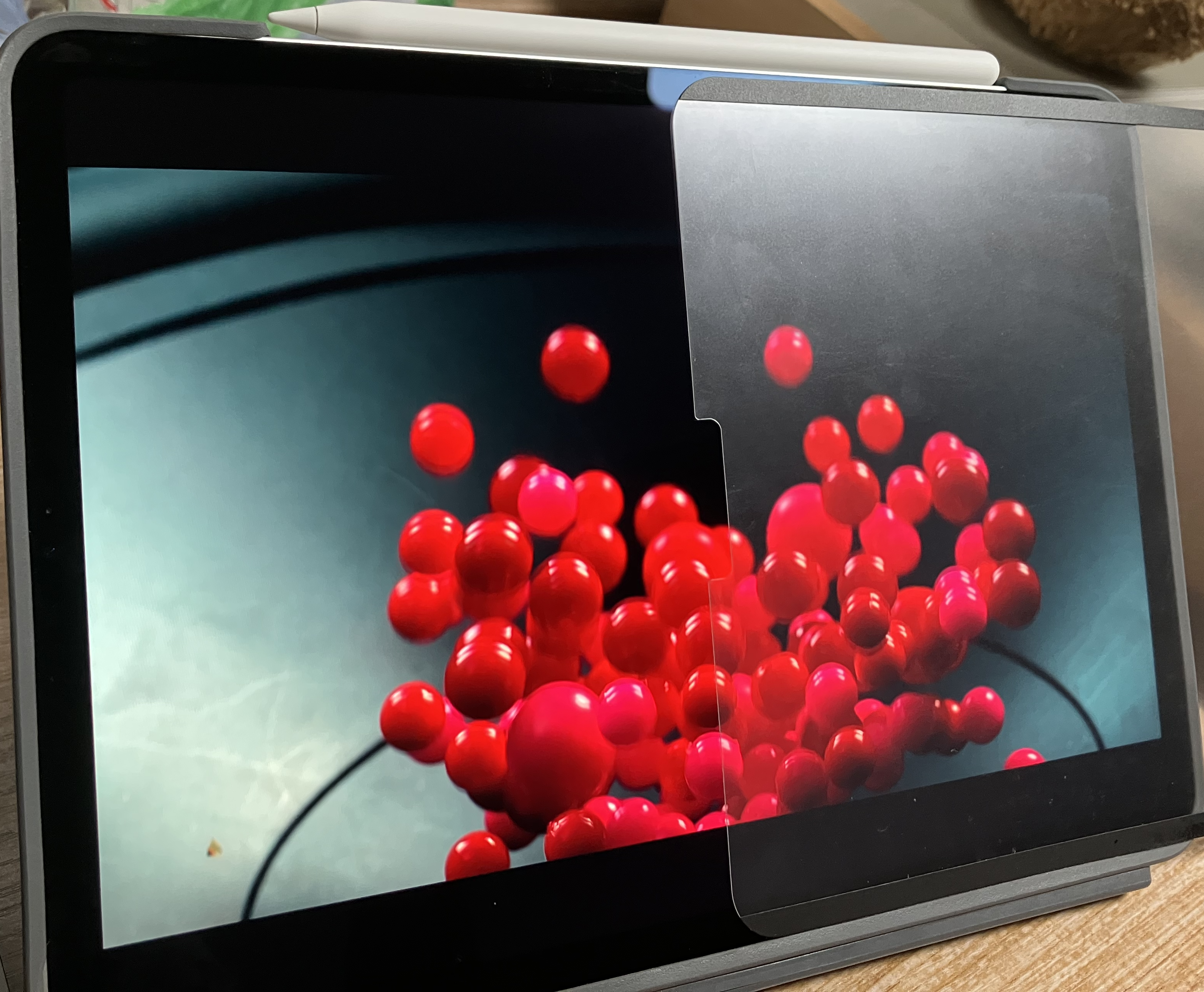 가장 중요한 필기감은 상당히 괜찮은 편이었다. 필기를하면서 필름 전체가 밀리는 경우도 있다고 하는데, 나같은 경우는 아래 사진처럼 전면 베젤을 덮는 케이스를 사용하고 있어 필름이 밀려나가는것을 막아주어서 크게 불편함이 없었다. 아마 일반 폴리오키보드를 사용하거나, 케이스 없이 사용하는 경우는 꽤 불편할 것 같긴 하다.
